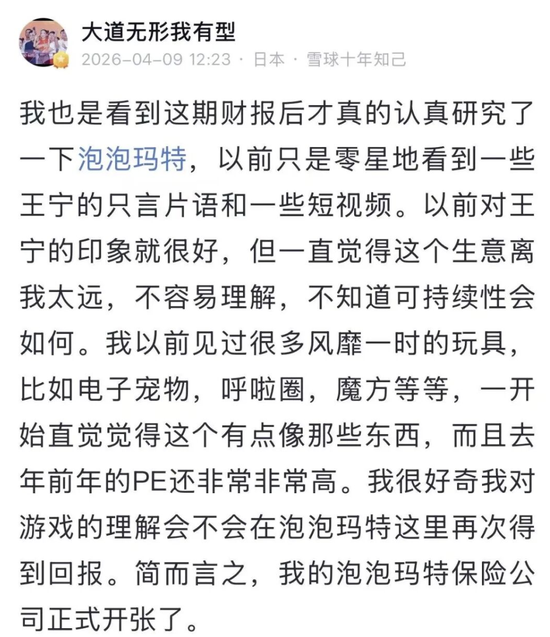 段永平说:“我也是看到这期财报后才真的认真研究了一下泡泡玛特,以前只是零星地看到一些王宁(泡泡玛特创始人)的只言片语和一些短视频。以前对王宁的印象就很好,但一直觉得这个生意离我太远,不容易理解,不知道可持续性会如何。我以前见过很多风靡一时的玩具,比如电子宠物、呼啦圈、魔方等等,一开始直觉觉得这个有点像那些东西,而且去年前年的PE还非常非常高。我很好奇我对游戏的理解会不会在泡泡玛特这里再次得到回报。”